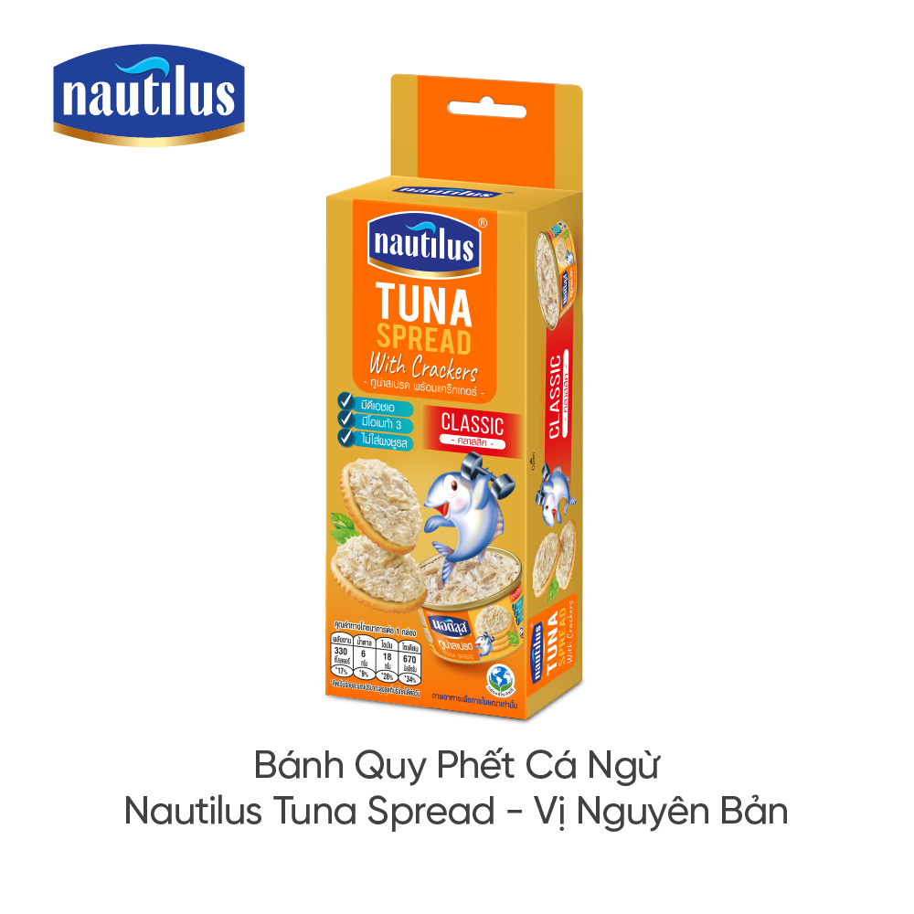 • LẤN ĐẦU TIÊN xuất hiện tại Việt Nam, Bánh quy phết cá ngừ Nautilus Tuna Spread là sự kết hợp tuyệt vời của bánh quy giòn và cá ngừ thơm ngon. Bạn sẽ được trải nghiệm từng chiếc bánh quy phết cá ngừ Nautilus rất tiện lợi, ăn liền ngay khi mở hộp bằng cách phết cá ngừ lên chiếc bánh quy như một món ăn vặt đầy dinh dưỡng.